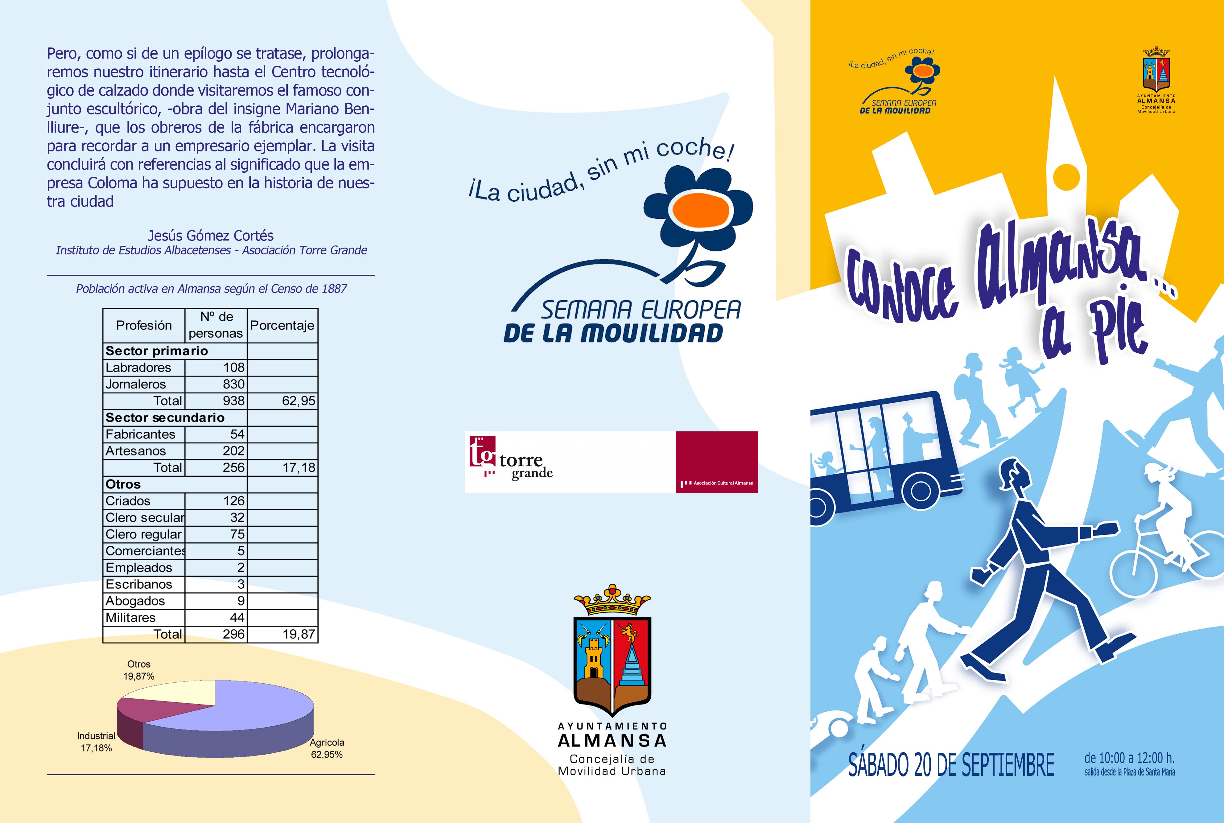 Este sábado 20 de septiembre, tendrá lugar la actividad «Conoce Almansa… a pie: de la Batalla a la industrialización», organizada por la Concejalía de Movilidad Urbana del Ayuntamiento de Almansa en colaboración con la Asociación Torre Grande. Dicho recorrido por el casco urbano de la localidad se enmarca dentro de la Semana europea de la movilidad, y tendrá como guía de excepción al presidente de Torre Grande Jesús Gómez Cortés, quien realizará un interesante trayecto por nuestra localidad deteniéndose en importantes hitos relacionados con el lema de la actividad. El comienzo del recorrido tendrá lugar en la Plaza de Santa María a las 10:00 horas de la mañana, y la actividad, de libre participación para todos los que deseen tomar parte en ella, tendrá una duración aproximada de dos horas.