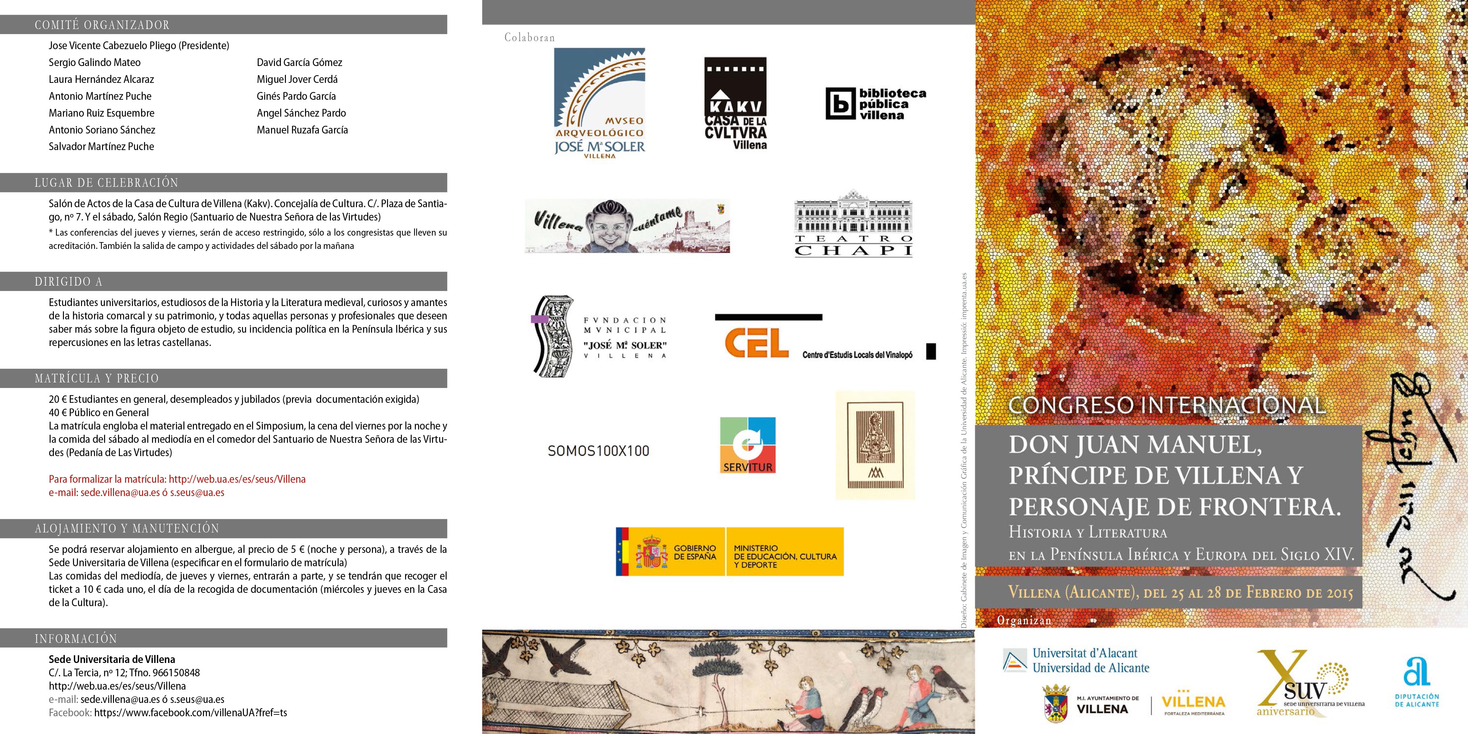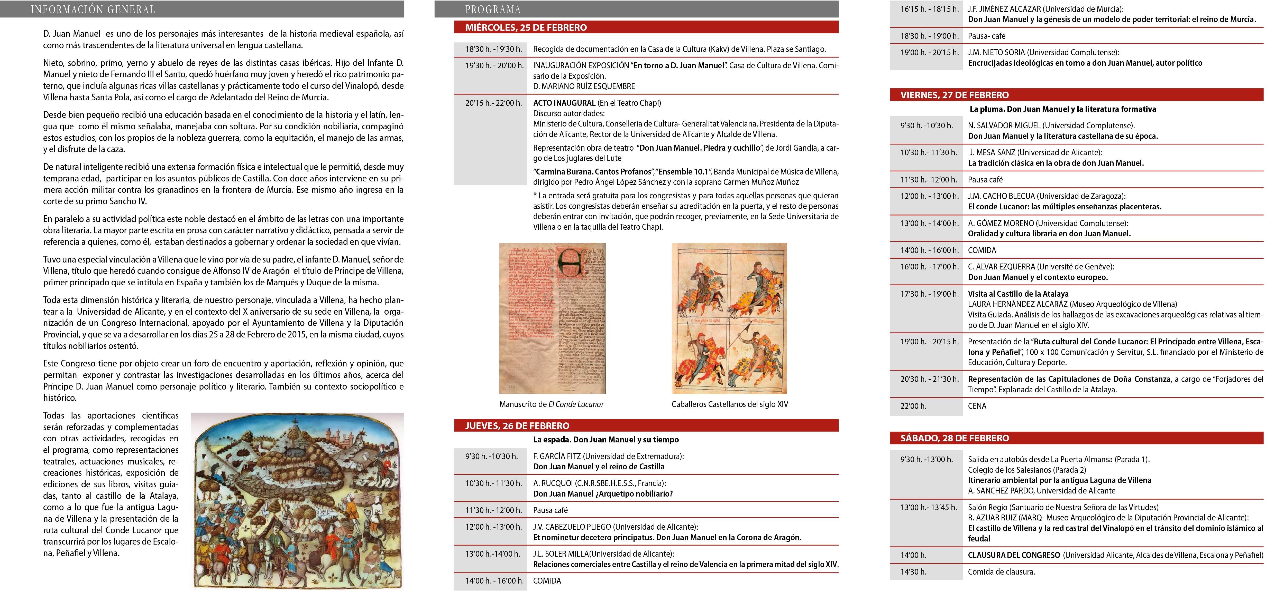 s días 25 al 28 de febrero se celebrará en la vecina localidad de Villena (Alicante), el Congreso Internacional sobre la figura de Don Juan Manuel. El congreso tiene como tema la figura del infante como «Príncipe de Villena y personaje de frontera. Historia y literatura en la Península ibérica y Europa del siglo XIV», y a partir de más de una decena de conferencias y ponencias, conciertos y visitas guiadas, se repasará la figura y la importancia de un personaje tan relevante para la cercana Villena, para la Castilla de la Baja Edad Media y, por ende, para nuestra propia ciudad de Almansa. Toda la información en las siguientes imágenes.