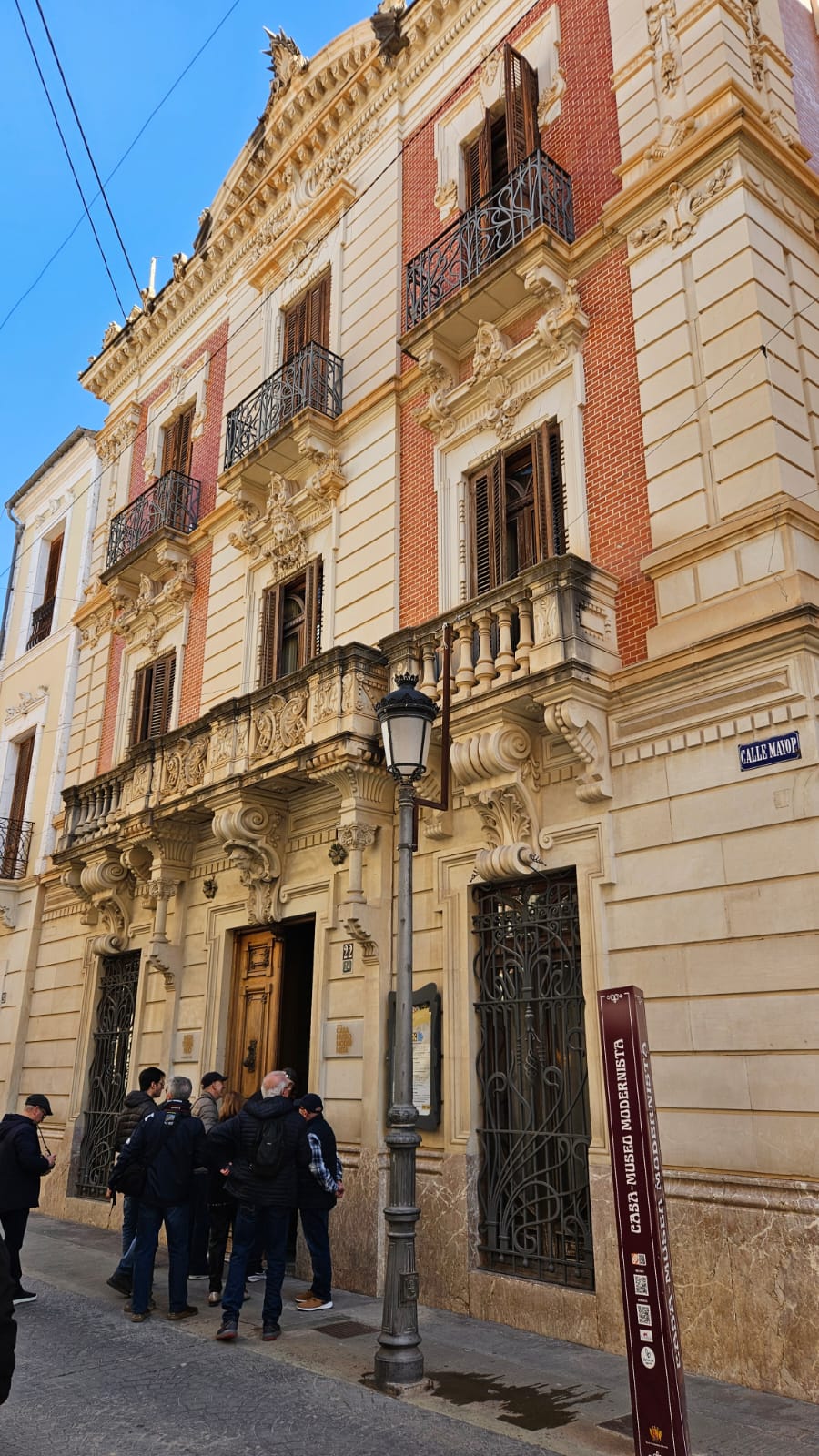 La mañana se completó callejeando por el centro histórico donde de nuevo asistimos a otros ejemplos de este importante movimiento: la Casa Mira, ahora Centro Cultural Gómez-Tortosa, de época algo anterior a la fiebre modernista, y el Casal del Fester, del arquitecto José Sala, caja de ahorros y hogar del jubilado antes de ser cedido, en el año 2008, a la Asociación de Comparsas de Moros y Cristianos Santa María Magdalena. En su fachada, de vivos colores, destacan los amorcillos que sujetan piezas con significados heráldicos.