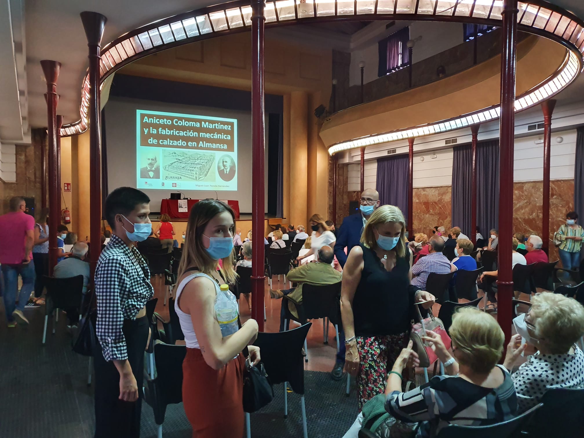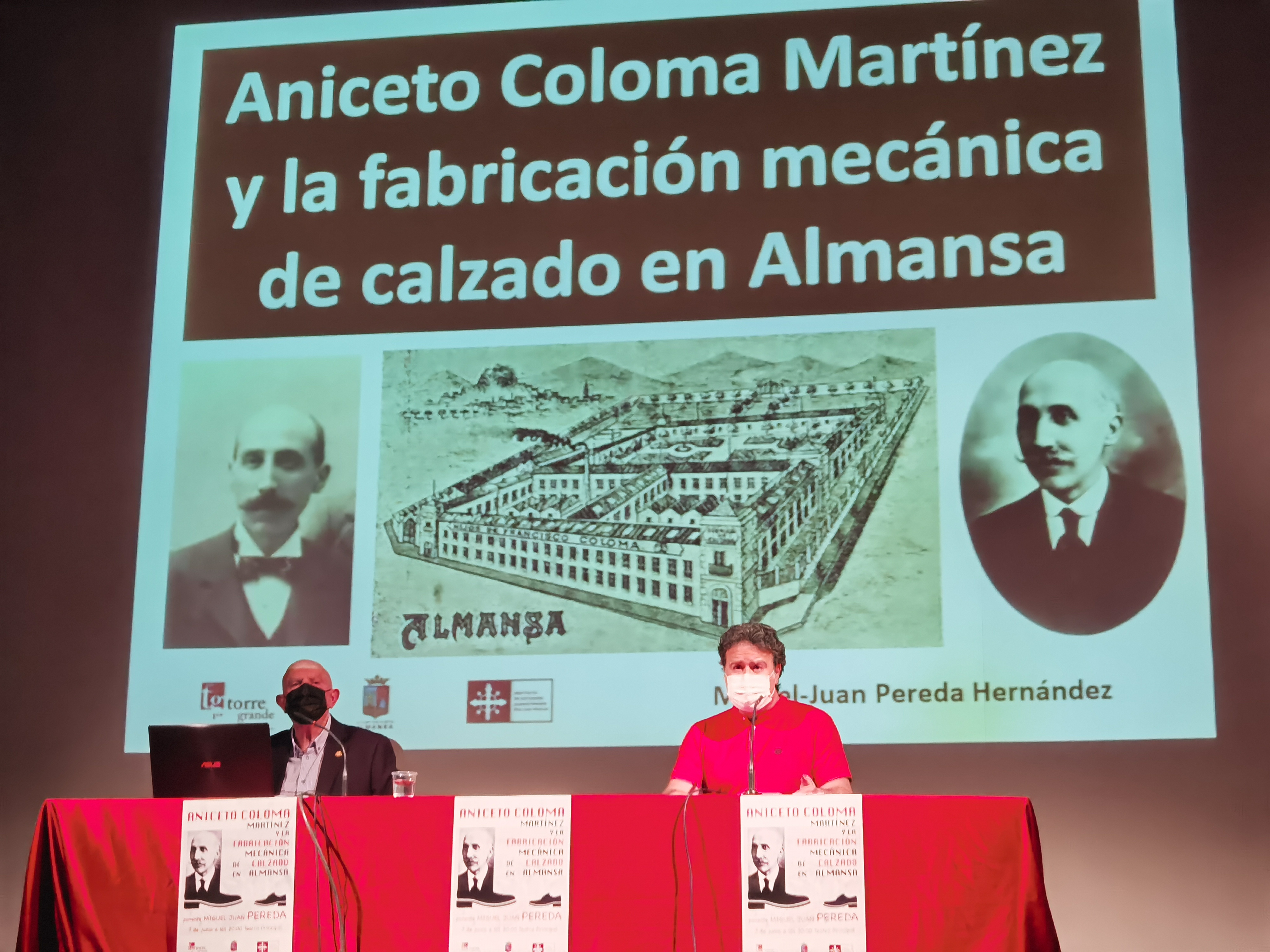 Ayer fue por tanto el turno de Aniceto Coloma y para ello contamos con Miguel Juan Pereda Hernández, cronista oficial de Almansa, que nos regaló una concienzuda y preparadísima ponencia sobre Aniceto y el desarrollo de la fábrica Coloma y del sector zapatero en general. Durante más 80 minutos, un teatro Principal abarrotado de público aún con las consabidas medidas de seguridad, y con asistencia de miembros de la familia Coloma, asistió a un enorme despliegue de información e imágenes, acompañado de los certeros comentarios de Miguel Juan.