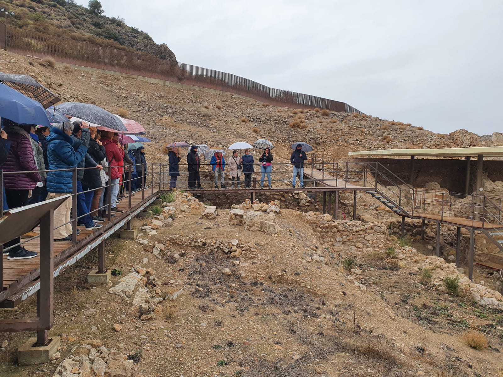 El sábado 9 de marzo fue la fecha escogida para realizar la visita a la localidad murciana de Cieza coincidiendo con la explosión de color de miles de frutales en pleno florecimiento. Aunque la lluvia nos acompañó durante el recorrido por algunos de los campos teñidos de rosa y blanco que se extienden a lo largo de casi 14.000 hectáreas, ello no fue impedimento para disfrutar de esta singular maravilla natural y paisajística, sin duda una delicia para los sentidos. Tras una parada en el centro de recepción de visitantes para reponer fuerzas, nos trasladamos al yacimiento hispano-musulmán de Siyasa en la ladera del cerro del castillo, un enclave estratégico desarrollado entre los siglos XII y XIII que fue abandonado tras la sublevación mudéjar de 1266 en favor del actual emplazamiento de Cieza. De las casi 800 viviendas que llegó a tener el poblado amurallado, se ha excavado una manzana de casas y se han levantado varios volúmenes articulados en torno a un patio central, una actuación que ofrece como en pocos sitios una idea del desarrollo urbanístico, la estructura doméstica y los elementos decorativos de las ciudades andalusíes.