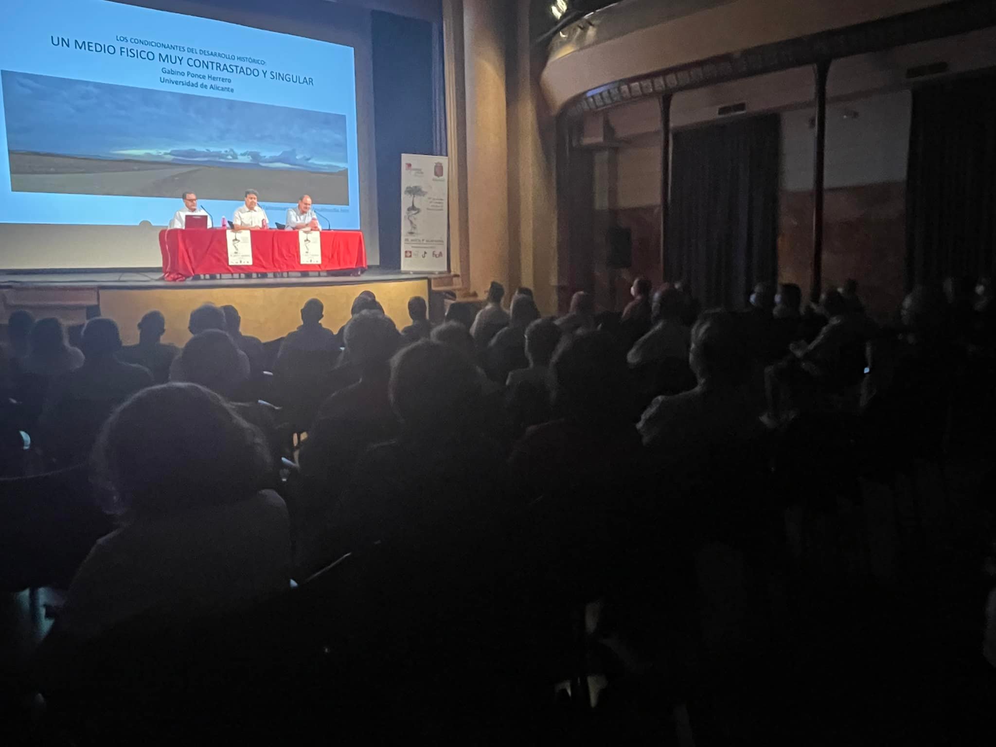 A continuación se desarrolló la primera ponencia de estas Jornadas con el título “Los condicionantes del desarrollo histórico: un medio físico muy contrastado y singular”, a cargo del catedrático de Geografía de la universidad de Alicante Gabino Ponce Herrero. En un teatro Principal con gran asistencia de público se habló de régimen pluviométrico, fosas kársticas, lagunas, inundaciones, plegamientos, eras geológicas… durante los 40 minutos de su brillante y preparada intervención, apoyada en una rigurosa y espectacular infografía.